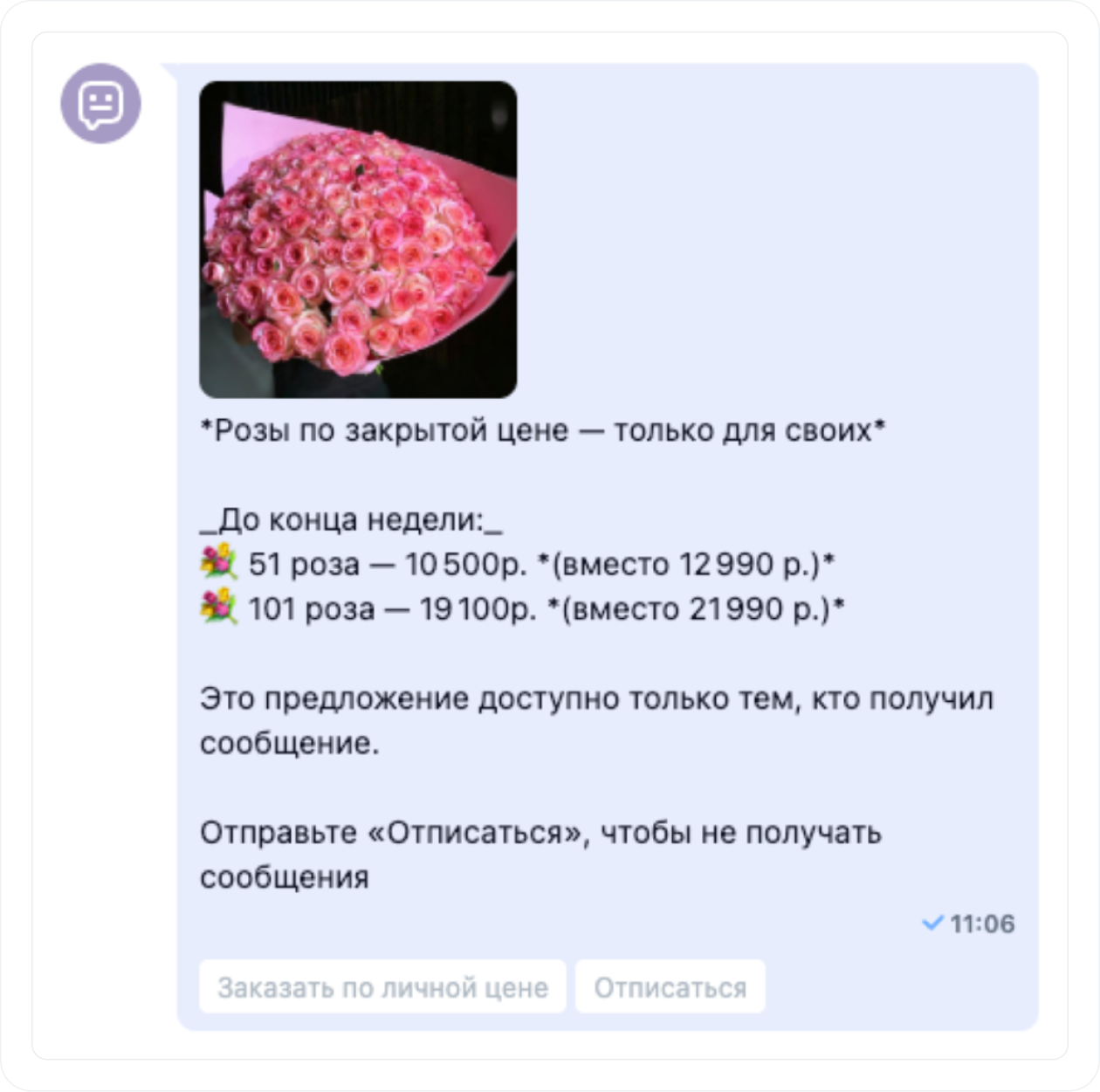 Компания использует WABA пока только для маркетинговых рассылок. Например, когда идёт сезон пионов, покупателям могут напомнить об этих цветах и о том, что в магазине привлекательные цены на них.