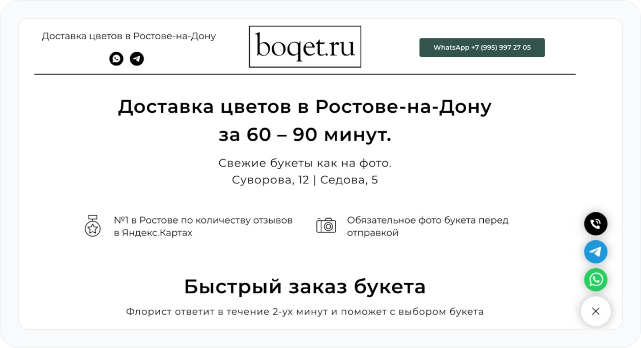 Одна из метрик, которой гордится boqet.ru — оценка 5.0 и самое большое число отзывов на Яндекс Картах в Ростове-на-Дону. Клиентов никак не стимулируют оставлять отзывы, поэтому высокий рейтинг — результат качественного сервиса, скорости и хорошей работы магазина.