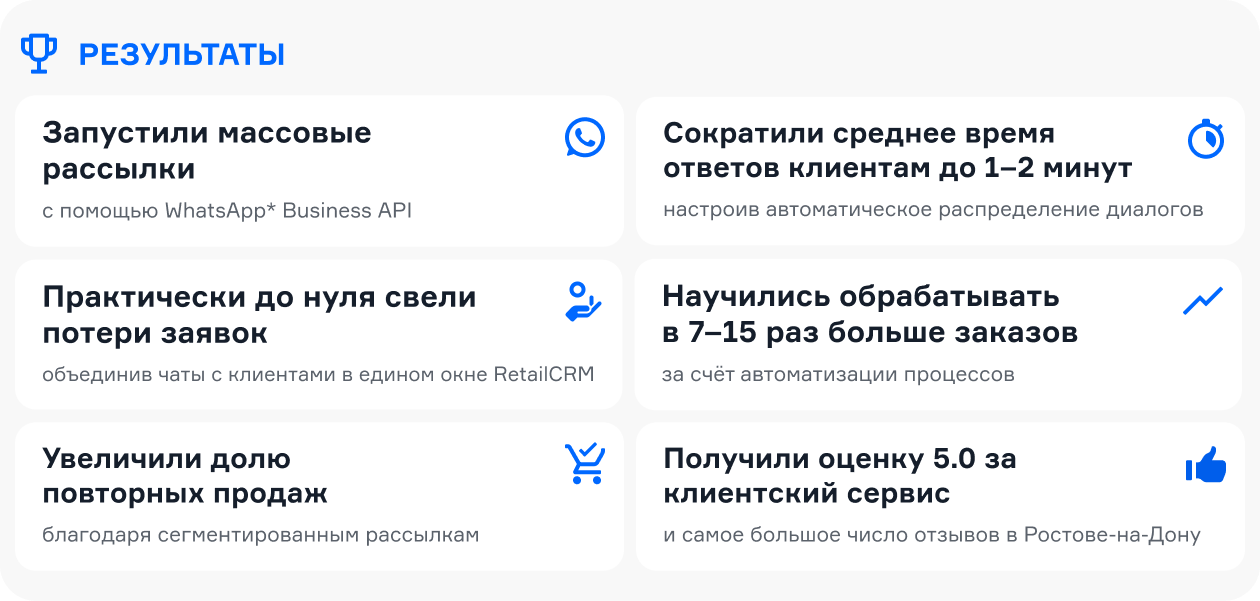 WhatsApp*-рассылки по действующим клиентам показывают хороший результат и приносят повторные продажи (объём не разглашается). Они служат стимулом к новым покупкам. Например, были случаи, когда клиент отвечал после рассылки: «Мне ничего не надо, но раз вы написали, давайте что-нибудь закажу».