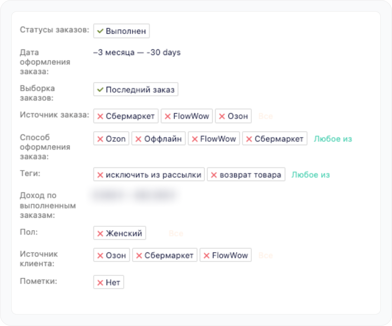 - источник клиента (письма получает те, кто заказывал на маркетплейсах),