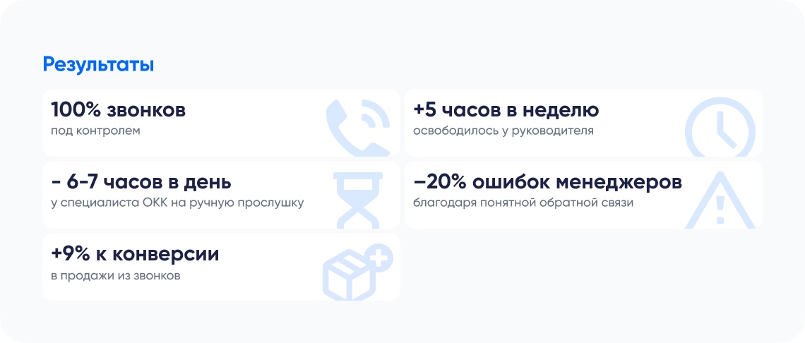 При этом картина по работе менеджеров оставалась неполной, так как вручную удавалось проверить только 1−2% всех разговоров. Из-за этого бизнесу становилось всё сложнее отслеживать, насколько эффективно общаются менеджеры, и принимать обоснованные управленческие решения.
